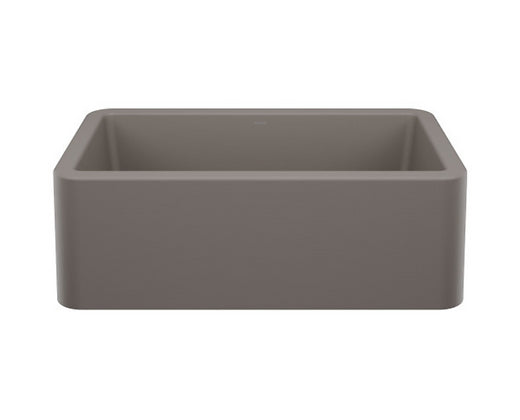 An apron-front kitchen sink crafted from durable granite composite material in a distinctive volcano gray color, offering both contemporary style and robust performance. Featuring a spacious single-bowl design, it provides ample space for washing large pots, pans, and utensils. The surface is highly resistant to scratches, stains, and heat, ensuring longevity and maintenance of its aesthetic appeal. Its non-porous, hygienic surface resists bacteria and dirt, promoting a cleaner kitchen environment. The fade-resistant color maintains its rich hue over time, even with prolonged exposure to sunlight and daily use. Designed for easy undermount installation, it seamlessly integrates with the countertop for a sleek, uninterrupted look. The modern design complements a variety of kitchen styles, making it a versatile choice for enhancing both functionality and decor.