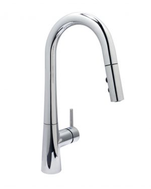 Featuring a sleek and modern silhouette, this polished chrome kitchen faucet is crafted to complement contemporary kitchen spaces. Its high-arc spout offers generous clearance, making it ideal for filling and cleaning large cookware. The faucet is constructed from premium corrosion-resistant materials, ensuring durability and a lasting shine. Equipped with a smooth single-handle operation, it allows precise control over water temperature and flow. The pull-down spray head provides versatile functionality with dual spray modes—stream and spray—for efficient rinsing and cleaning tasks. A 360-degree swivel spout enhances maneuverability, catering to all sink areas. Designed for easy installation, it fits standard sink configurations and includes all necessary mounting hardware. This faucet seamlessly blends style and performance, making it a practical addition to any kitchen.