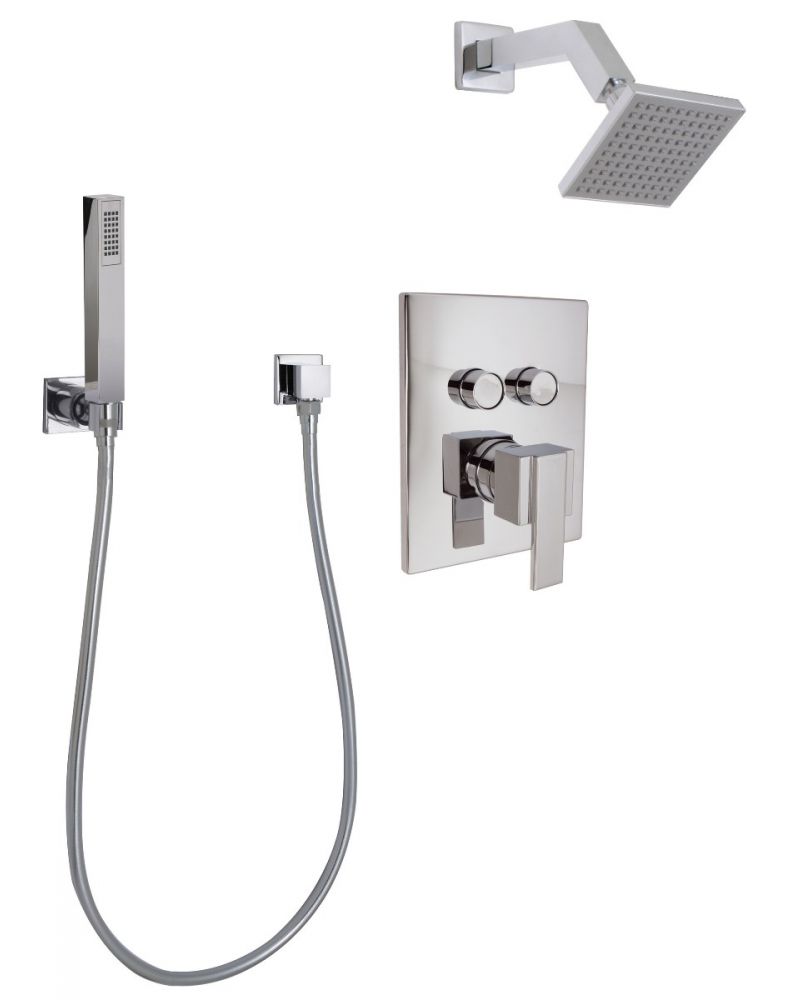 A polished chrome shower combo kit featuring a modern push-button diverter and an elegant wand showerhead, designed with a contemporary square aesthetic to complement modern bathroom decor. Constructed from durable brass for long-lasting performance, this kit offers seamless switching between the overhead shower and the handheld wand through an intuitive push-button mechanism, providing versatility and convenience. The sleek polished chrome finish adds a touch of sophistication while ensuring resistance to tarnishing and easy maintenance. With user-friendly installation and high-quality components, this shower combo kit combines functionality with stylish design to enhance the showering experience.