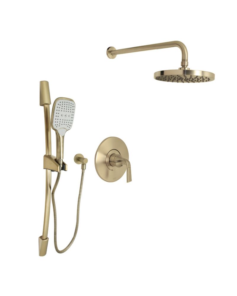 Designed with a luxurious satin brass finish, this shower combo kit brings timeless elegance and modern sophistication to any bathroom setting. It features a combination of a fixed showerhead and a handheld wand, providing flexibility and personalized comfort during use. Engineered for optimal water flow and even distribution, both the showerhead and wand offer a soothing and invigorating experience. Constructed from premium quality materials, the system ensures durability and resistance to corrosion, maintaining its exquisite appearance over time. The ergonomic controls facilitate ease of use, and the kit is compatible with various plumbing configurations for straightforward installation. The sleek design and superior craftsmanship make it a distinguished choice for those seeking to enhance both the functionality and aesthetic appeal of their bathroom fixtures.