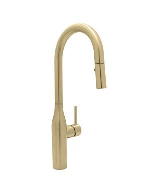 This contemporary kitchen faucet boasts a sophisticated rise design that seamlessly blends form and function, enhancing the modern kitchen ambiance. The satin brass finish exudes warmth and elegance, adding a touch of luxury to any culinary space. Engineered with precision, it features a high-arc spout that provides ample clearance for filling and cleaning large cookware. The single-handle operation offers effortless control over water flow and temperature, ensuring a smooth user experience. Crafted from premium materials for durability, it resists corrosion and tarnishing, maintaining its pristine appearance over time. The faucet includes a convenient pull-down sprayer with multiple spray settings, allowing for versatile use from rinsing produce to tackling tough cleaning tasks. Easy to install with standard plumbing connections, it is an ideal upgrade for those seeking both style and practicality in their kitchen fixtures.