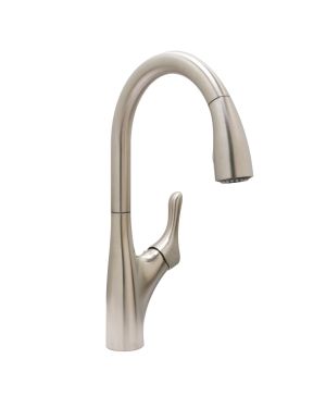 Featuring a sleek and timeless design, this kitchen faucet enhances any modern kitchen decor. The satin nickel finish offers a warm, inviting look while resisting fingerprints and water spots, ensuring a clean and polished appearance over time. Constructed with high-quality materials for long-lasting durability, it delivers reliable performance for everyday use. The high-arc spout provides ample clearance for filling large pots and pans, and its smooth swivel action allows for easy maneuverability around the sink area. Equipped with a pull-down spray head, it offers dual-functionality with both stream and spray modes to facilitate various kitchen tasks. The single-handle lever ensures effortless control over water temperature and flow, contributing to a seamless and efficient user experience. Designed for easy installation, it accommodates multiple sink configurations and includes all necessary mounting hardware. This faucet seamlessly combines style and functionality, making it a valuable addition to any kitchen space.