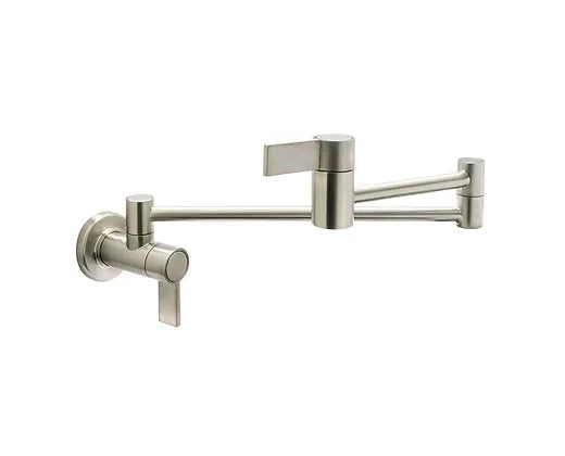 A satin nickel pot filler faucet offers both functionality and elegance to any kitchen space. Designed with a classic style and a sleek satin nickel finish, this wall-mounted faucet is perfect for convenient filling of pots directly on the stove, reducing the need to carry heavy water-filled pots across the kitchen. The dual-jointed swing spout provides extended reach and folds away neatly when not in use, maximizing kitchen efficiency and space. Crafted from durable materials for long-lasting performance, the faucet features ceramic disc cartridges for smooth operation and drip-free use. Easy to install and compatible with various kitchen designs, this pot filler is a practical and stylish addition to modern culinary spaces.