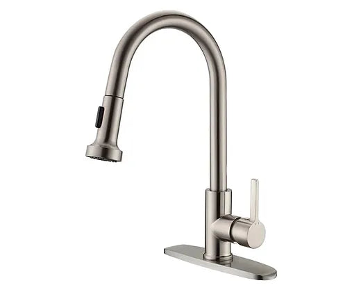 Featuring a brushed nickel finish, this kitchen faucet offers a seamless blend of modern aesthetics and practical functionality suitable for any kitchen decor. Crafted from high-quality materials for enhanced durability, it features a high-arc spout that provides ample clearance for filling large pots and pans, ensuring ease of use during meal preparations. The pull-down spray head comes with dual-functionality, allowing a smooth transition between an aerated stream for gentle washing and a powerful spray for heavy-duty cleaning tasks. Equipped with a ceramic disc cartridge, it ensures reliable, drip-free operation and precise control over water temperature and flow. The single-handle design simplifies adjustments and promotes ergonomic use, while the 360-degree swiveling spout offers full sink access for added convenience. Designed for straightforward installation, it accommodates various sink configurations and includes all necessary mounting hardware. The faucet's sleek surface resists fingerprints and water spots, making it easy to maintain and keeping the kitchen looking pristine.
