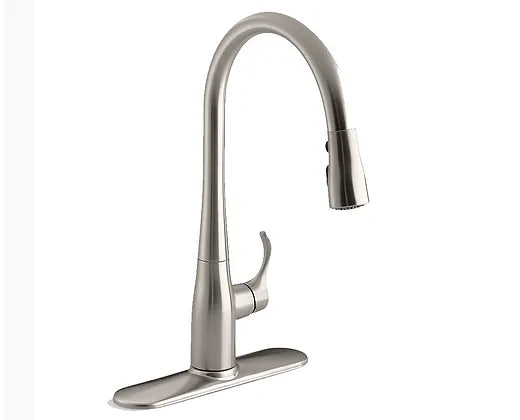 Featuring a high-arched spout with full 360-degree rotation, this kitchen faucet provides exceptional clearance for filling large pots and easy sink access. The pull-down sprayhead offers versatile functionality with a range of spray options, including an aerated stream for everyday use, a powerful spray for heavy-duty cleaning, and a unique feature that boosts water flow for rapid filling tasks. The magnetic docking system ensures the sprayhead securely locks back into place after use. Constructed with durable materials, this faucet boasts a corrosion-resistant finish that maintains its brilliance over time. The single-handle design allows for effortless water temperature and flow control, while the easy-to-clean surfaces resist mineral buildup, ensuring lasting performance. Installation is adaptable, accommodating various sink configurations with the included deck plate.