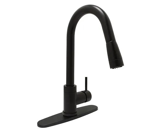 Designed with meticulous attention to detail, this matte black kitchen faucet offers a harmonious blend of modern aesthetics and superior functionality. Its elegant, high-arched spout facilitates the washing of large cookware, while the sleek finish resists smudges and water spots, ensuring a consistently pristine appearance. The faucet features a single-handle design for seamless control of water temperature and flow, and a 360-degree swivel spout that provides full sink access for added convenience. Equipped with a pull-down sprayer, it offers multiple spray settings to effortlessly handle various kitchen tasks, from gentle rinsing to powerful cleaning. Constructed from premium materials for enhanced durability, it promises long-lasting performance. The faucet is compatible with single or multiple-hole sink installations and includes all necessary hardware for easy setup. Its sophisticated design complements a variety of kitchen styles, adding a touch of elegance and enhancing the overall aesthetic appeal of the space.